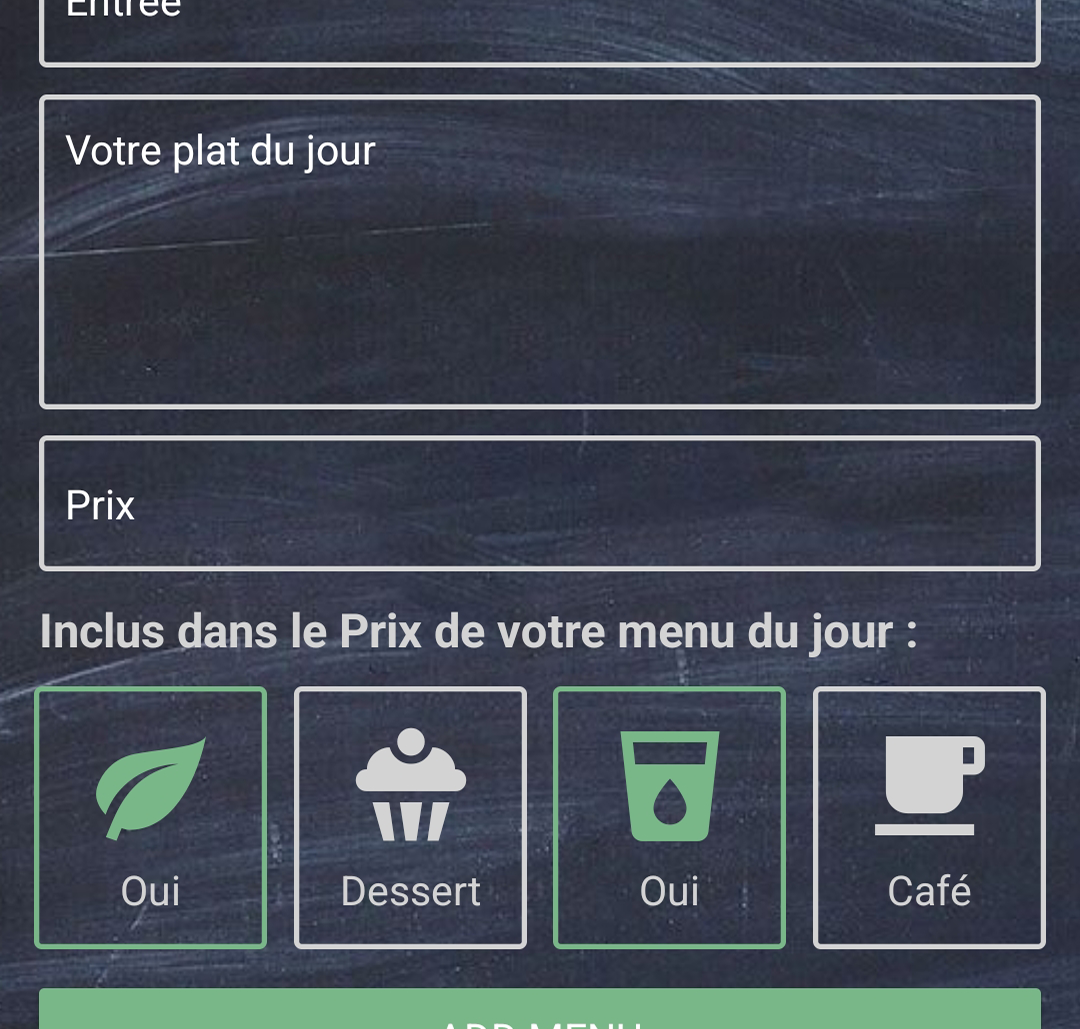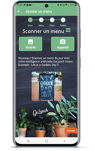 Ajoutez vos menus en les géolocalisant. Nouveau : Scannez votre ardoise et laissez notre intelligence artificielle faire votre travail.