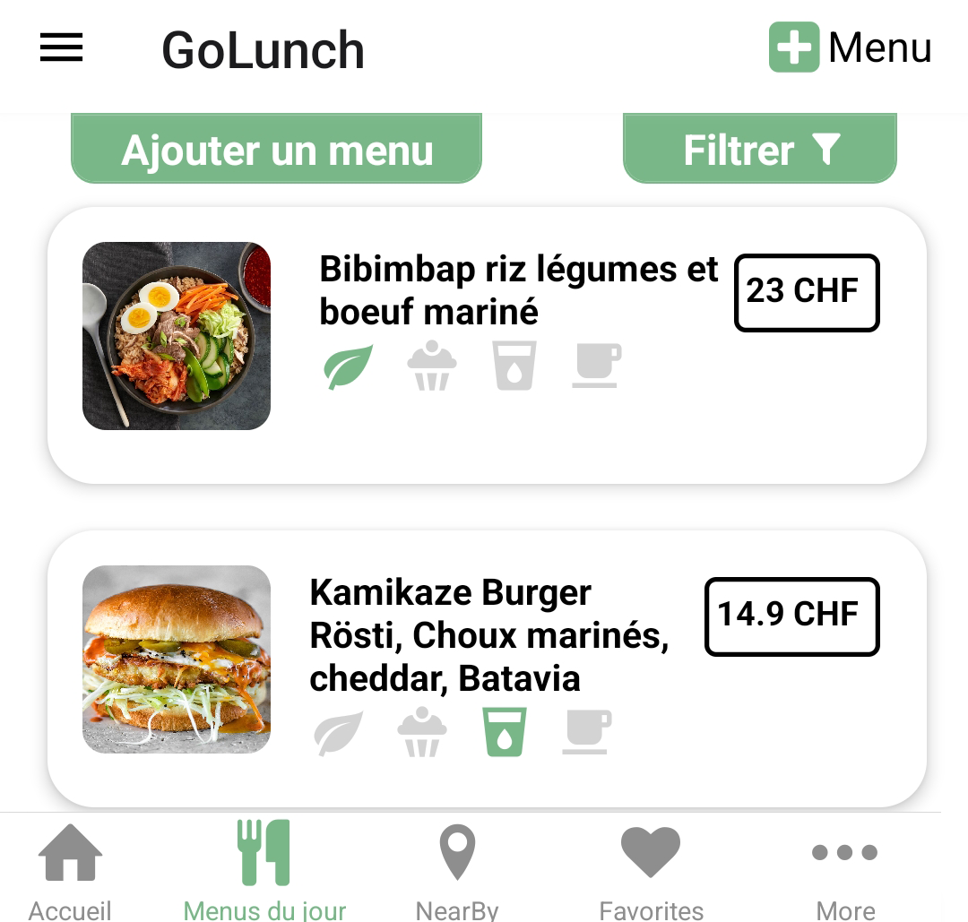 Découvrez les menus du jour proche de chez vous. Filtrez ceux-ci selon vos préférences et ajoutez vos restaurants préférés en favoris.